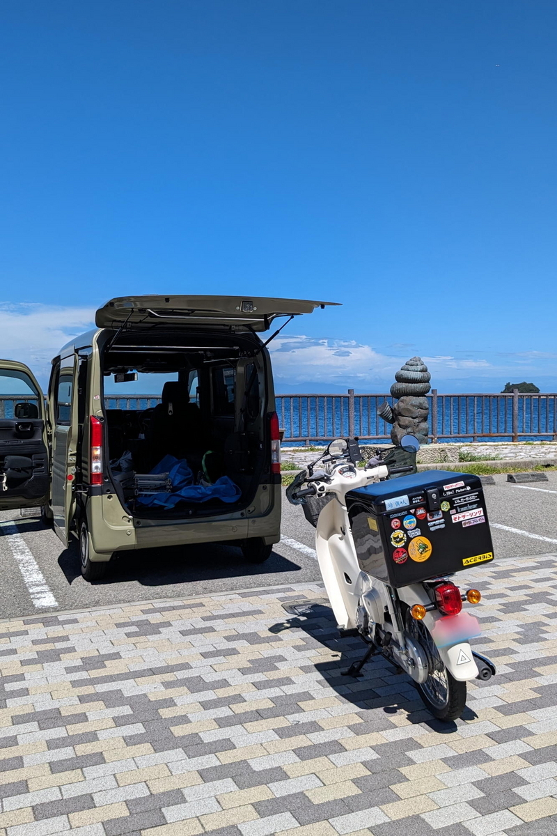 しかし、天井の高いN-VANならもっとサクッと積めると思っていたんですが、天井に荷物用のバーがあって若干低くなっていたこと、うちのカブには取り外しの効かない大きなボックスと前カゴがあることで積載の自由度が低く、難しかったです。