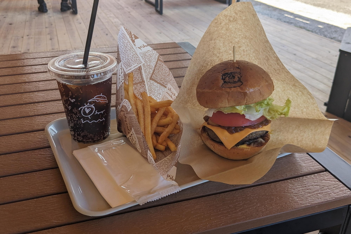 そろそろお昼が近いなーと思いながら走っていて、「淡路島バーガー」との幟が出ているのを見て、オープンテラスのカフェHasamikitchenに立ち寄ります。チーズバーガーにしましたが、兵庫県だからか、都会価格ですね…。バーガーは美味しかったですが、ポテトは塩味が強すぎました…(;´Д`)