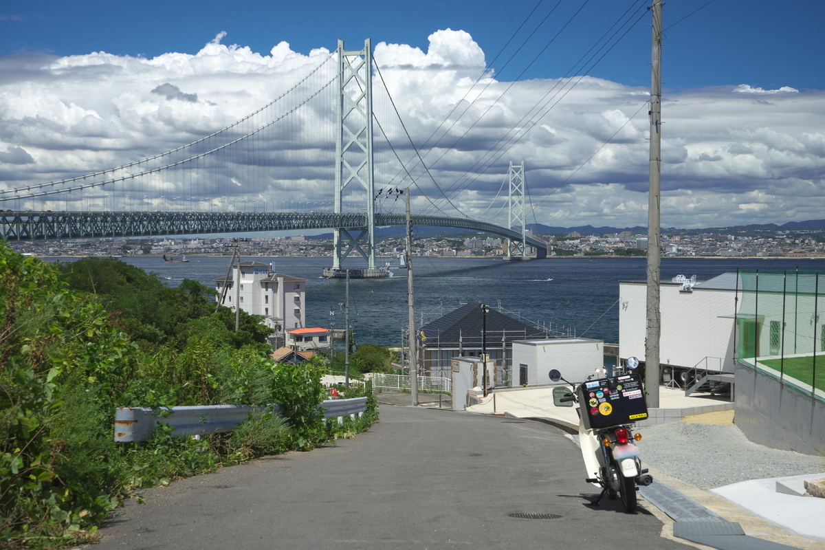 いつも高速道路の北淡インター付近から見える海の景色が良かったので、その景色を探して海沿いから少し上がってみました。すると、高速をくぐるところから良い感じに海と明石市~播磨町辺りの町並みが綺麗に見えるところがあり、良かったです(*´∀`)