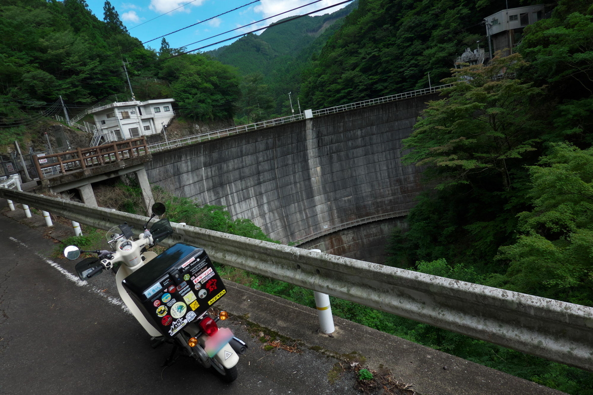 で、ここも以前から来てみたかった大美谷ダムです。こんな狭く、道も険しい立地でよくこんなダム造ったな、というところにあります。これまたアーチ式の美しい造形で、上流から見た湖水も美しいエメラルドグリーンでした(*´∀`)