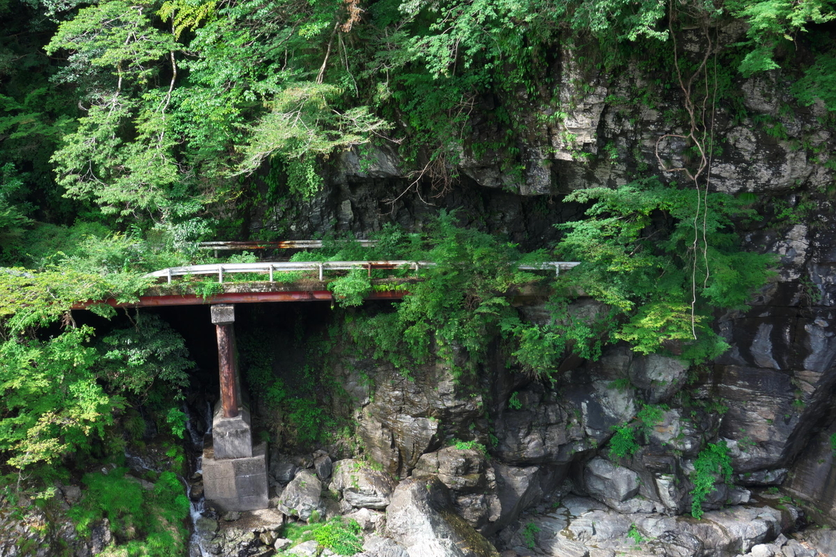 この奥吉野渓谷は、かなり侵食の進んだ深い渓谷です。昔は、その岩場に隧道を穿って道を通していたようで、上の写真の橋から旧道が見えています。かなりスリリングな造りで、通れるものなら通ってみたかったですが、現在は通行禁止になっています。あの橋も朽ちかけていますね…:(;゙゚'ω゚'):