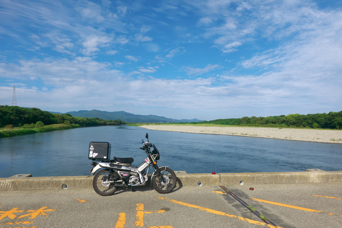 途中から国道377号線、さらに分岐して県道3号線で県境を越えます。本来、3号線はハンターカブの向こう側に見える林道?なんですが、このように通行止めになっていますので、途中から市道で377号線に戻ります。